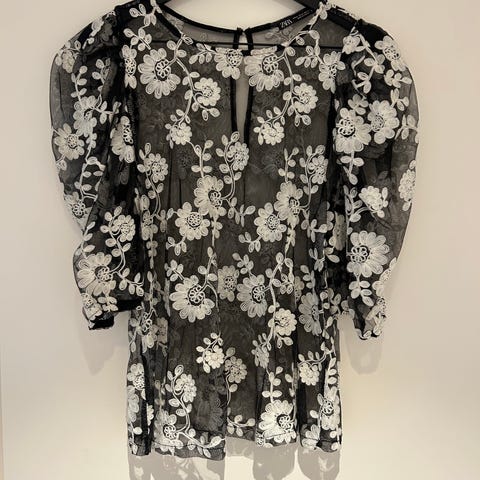 Pen bluse fra Zara i hvit og mørk blå. Flatterende.