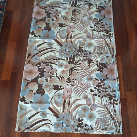Stoffbit. Kjøpt på 80-tallet. Brukt som duk. Sikksakksøm på kortsidene, jare på langsidene. Ikke strøket. Selges slik. Kjøper betaler porto