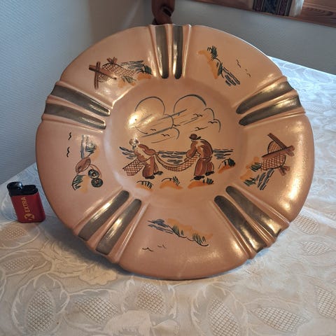 Servisefat i keramikk med dekor av frukt i hjørnene. Måler ca. 40 cm i lengde og 30 cm i bredde. Fatet har en flettet kantdesign med grønn og hvit farge. Egnet for servering av mat eller som dekorativt element.