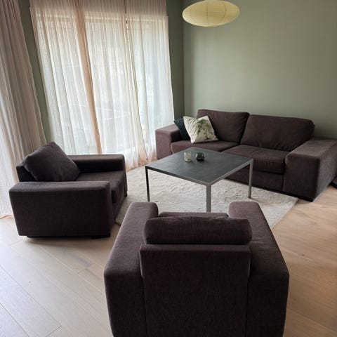 2-seter sofa i brunt stoff, sort understell, uten armlen venstre og med armlen h