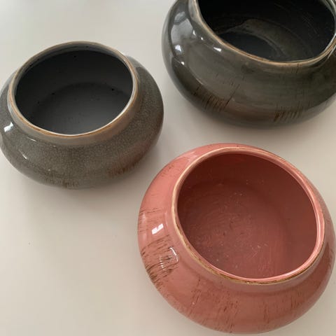 To mørk lilla blomsterpotter i glasert porselen selges samlet for 150,- kr. Fin spesiell lav fasong som skrår utover på midten. Den største er 10,5 cm høy og 20 cm bred (13 cm krukkeåpning), den minste 8,5 cm høy og 18 cm bred (12 cm åpning). Svært pent brukt, i god stand. Fine til advent.