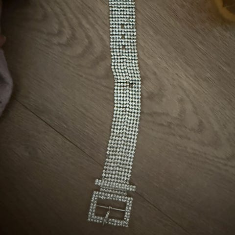 Usikker hvilket materiale det er av men ser ut som det sorte og hvite er av skinn eller noe annet tekstil. Med en plast stein i midten.Flott smykke, men blir ikke brukt.