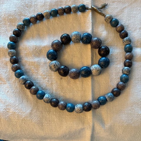 Smykke i tre. Farger: grå, grønn, offwhite. Ikke brukt. Selges kr. 100,-