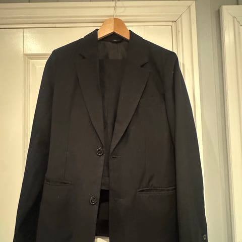 Selger denne kjempe fine dressen.Den selges på grunn at den blei for liten.Følger med en blå skjorte.Jakka str 170.Buksa str 164 og skjorta er S.Veldig fin.Bildet blei veldig utydelig.Fin og hel.Må strykes