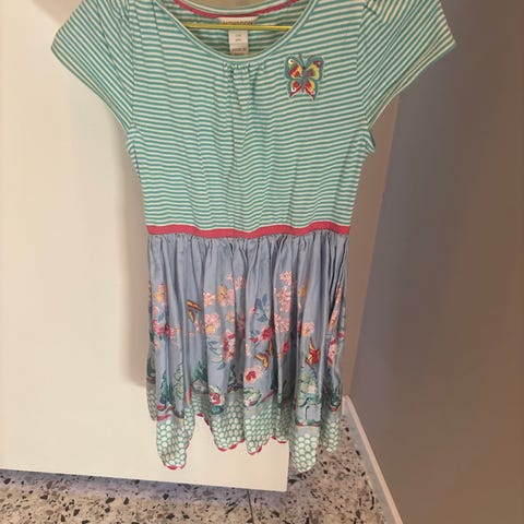 Veldig fin kjole. Den mangler noen paljetter her og der, men det er ikke fremtredende. Str. 110–116.