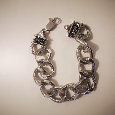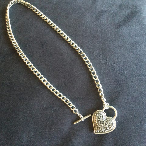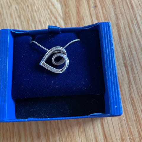 Nydelig sølvfarget halskjede og hjerteanheng med blanke steiner til salgs kr 200. Anhenget er likt på begge sider. Det er brukt bare 2-3 ganger.