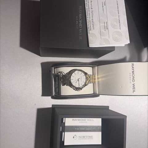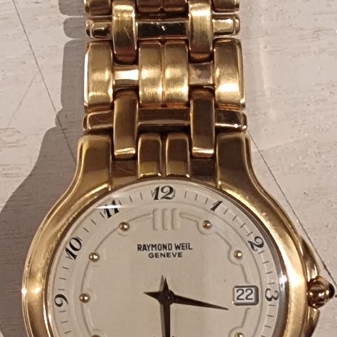 Strøken Raymond Weil dameklokke selges. Diamantbesatt modell, Ø 28mm. Kjøpt hos urmaker i 2009, svært lite brukt. Nylig vært til service, nytt batteri. Kjøpsgaranti kort, service kort, eske og ekstra ledd følger med.