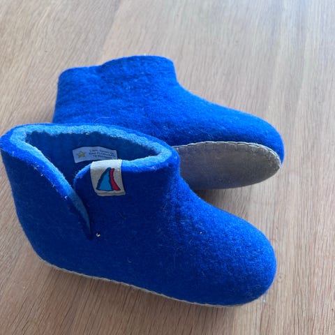 Pent brukte ulltøfler fra Tova selges. Skinnsålen er like hel.