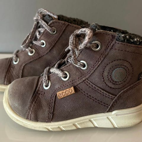 Brun sko til høst/vinter/vår i nubuck-skinn fra Ecco, med Goretex. Fôret, snøring og glidelås i siden. Godt brukt, men ingen kraftig slitasje (se bilder).