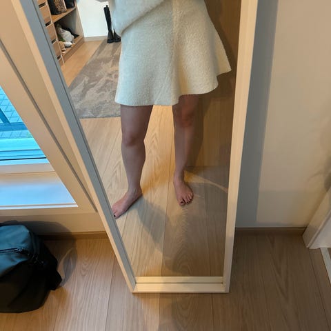 når du snurrer blir den veldig bred, da den har en A-form. den er creme Eller beige-hvit, så ikke brudekjole hvit. den er M-L størrelse, da den har litt strikk i midjebåndet.