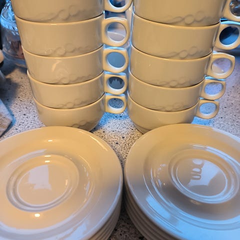 Kaffeserviset har 13 asjetter, 12 tefat, men bare 8 kopper. Noen av koppene er slitt og litt krakelert. Se oversikt under.