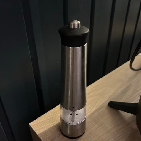 Pen og lite brukt stor elektrisk pepperkvern. Pepperkvern går på vanlige AA batterier som gjør at det er enkelt å skifte og enkelt å få tak i rimelige batterier. Kvernen er enkel å fylle på pepper og det er enkelt å justere grovheten på pepper. Pepperkvern har elektrisk lys som lyser opp ved bruk. God stand. Pepperkvernen er relativt stor og ca 23 cm høy.