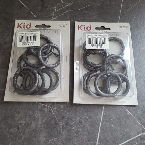 Sorte gardinmaljer selges. Ytre mål er 4.5cm og hullet inni er 2.8cm. Jeg har to poser. Kr.25.- pr.pose