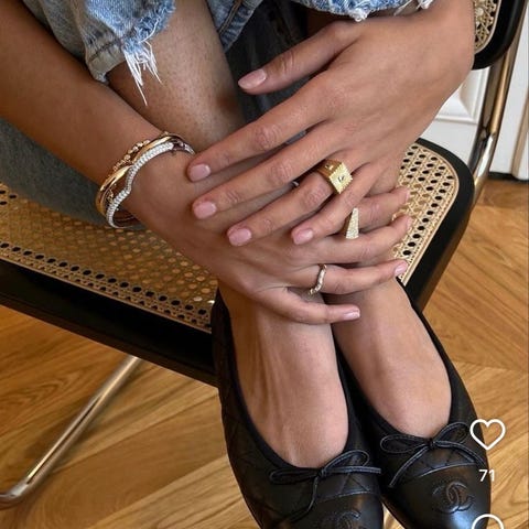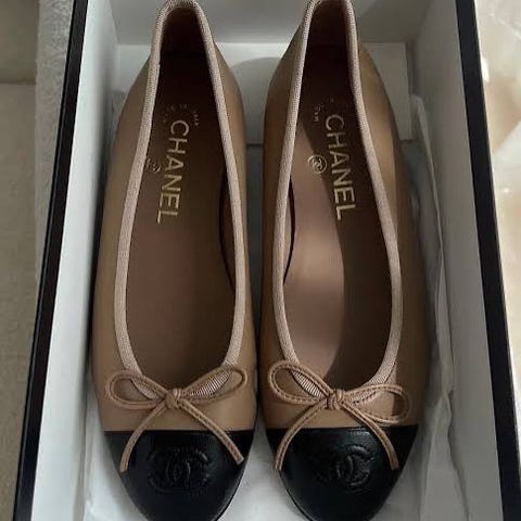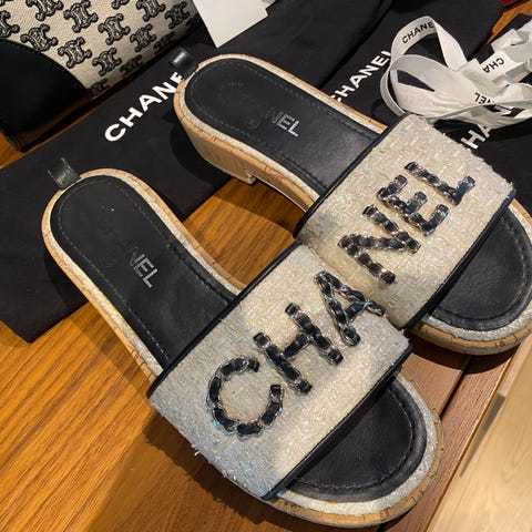 Ikoniske og svært ettertraktet slides fra Chanel i klassisk tweed med logo i Chanel-chain.