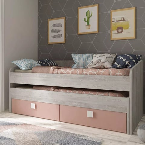 Skuffen under senga gir mulighet for en tredje soveplass. Ved å enkelt dra ut skuffen som har sengebunn kan sengen brukes av 3 stykker. Den skyves enkelt inn under senga igjen når den ikke er i bruk og det gir et ryddig barnerom.