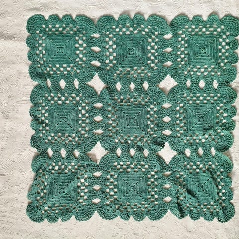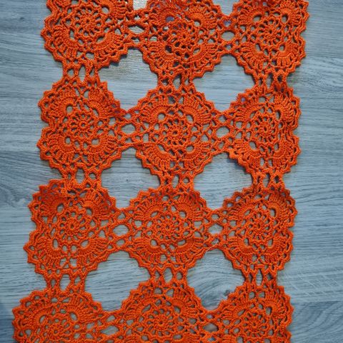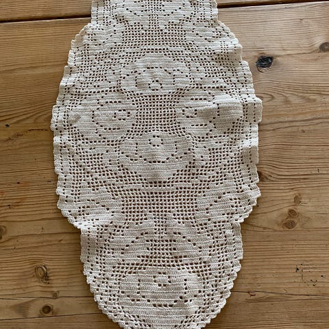 Liten håndheklet duk. Fargen er lilla og hvit. Ser annerledes ut på bildet på grunn av lyset.