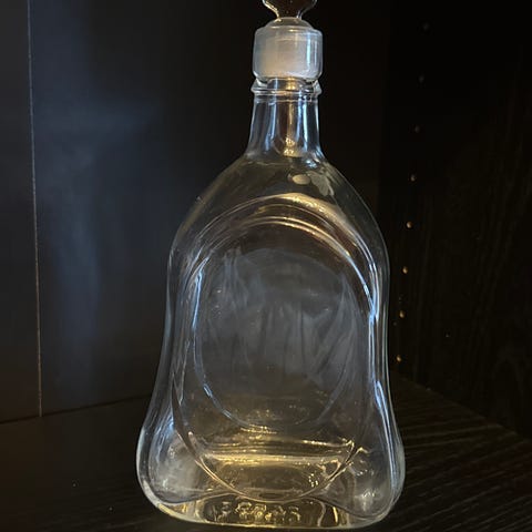 Ca 18 cm høy fra bunn til topp av kork/ propp som er i korkmateriale og tinn.