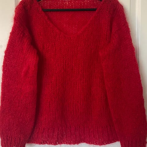 Rødt genser strikket i superwash garn. Lengde ca 63 cm. Omkrets ca 100 cm, lenge ermer fra armhulen ca 47 cm
