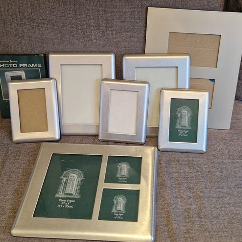 Tre "vinkelrammer" i sølvplett. Rammene har to glass der bildet legges mellom. Dekorative pene rammer som er helt nye i eske. selges kr 300,- Sender i post. Kjøper betaler porto/frakt.