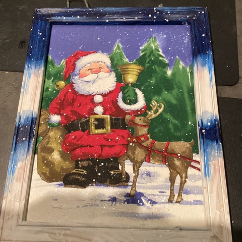 To broderte nissebilder pent rammet inn med gullrammer. Yttermål på rammene er 14,5 x 14,5 cm. Selges for 175,- pr stk eller 2 for 320,-