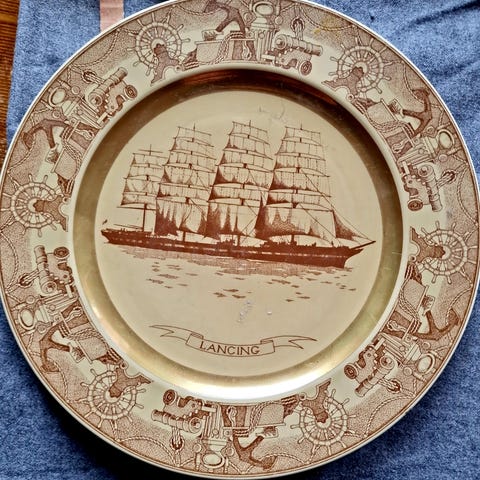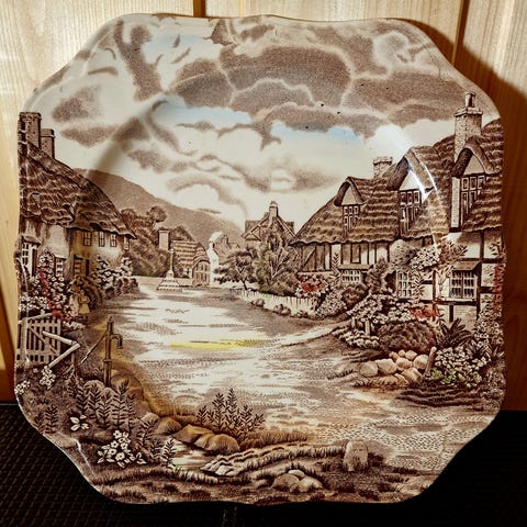 Figjo Flint gammelt fat med landskaps motiv og gård.