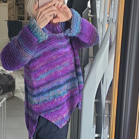 Mål: 58 cm hel lengde, 102 cm overvidde, 46 cm ermelengde. Genseren er ganske tøyelig i alle retninger, og dekker størrelsene X Small - Medium; avhengig av hvor romslig man ønsker å ha den.
