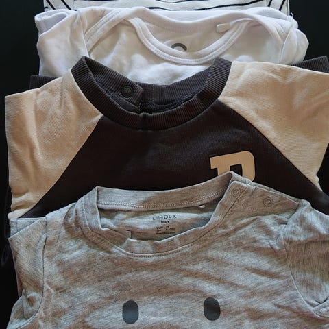 Selger en pakke med bodyer i str. 74, gutteklær.
