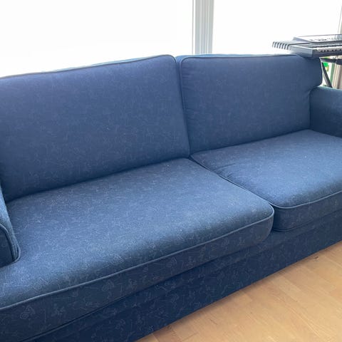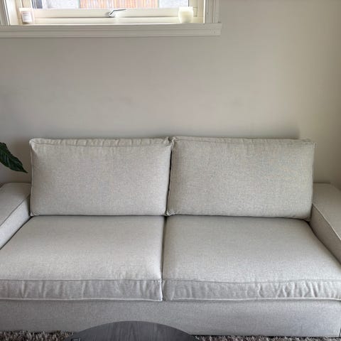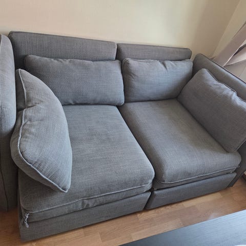 Grå IKEA Stockholm 3,5 seter sofa. Klassiker som IKEA avviklet salget av i 2014, men som det fortsatt er mulig å kjøpe ferdigsydde trekk i ulike farger og stoff til.