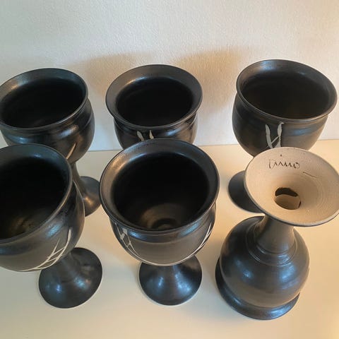 7 håndlagde vinglass i keramikk fra 70-tallet, selges samlet. De har blitt matte i bunnen og egner seg nok best som pynt. 3 av de har et lite skår i stetten, se 3 siste bilder. Ca. 15 cm høye og 10 cm på det bredeste.