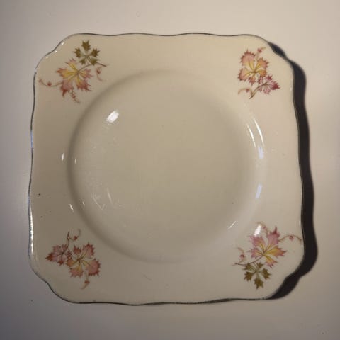 En hvit asjett med blomsterdekor og gullkant.