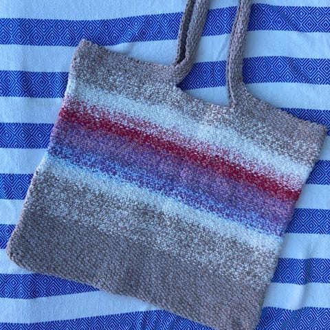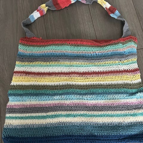 Ny heklet skulderveske. Heklet i 100 % bomullsgarn. 31 cm høy, 34 cm bred. Hank, totalt, 93 cm lang. Bunn 8,5 cm.Heklet i røyk og dyrefritt hjem.
