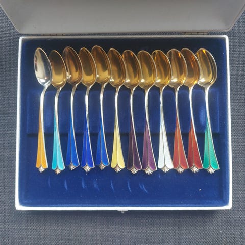 12 stykker meget pene mokkaskjeer i Sterling sølv. De er gullforgylt og emaljert. Små bruksspor. Ut fra det jeg kan se meget penbi emaljen. 9,3 cm lang. Selges hver for seg,6 stk i pen eske som vist på bilder!Se bilder. 6 stk. Kr 1500, 12 stk 2900,-