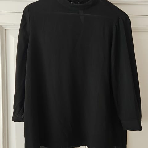 Svart klassisk bluse med utsvingete ermer. Linning i halsen med trykk knapper bak. En liten v-utringning i ryggen.
