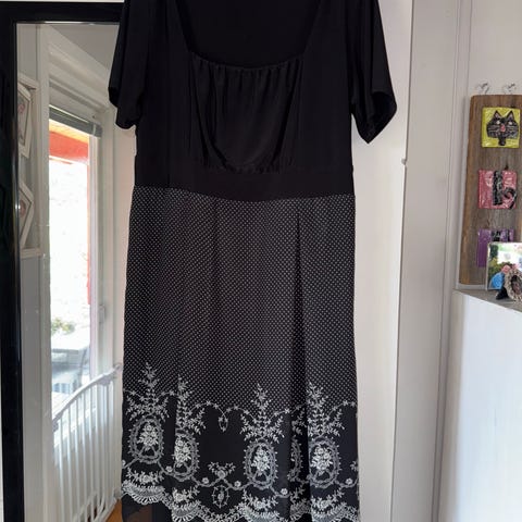 Kjempefin sort enkel kjole, str 34. Brukt to ganger. Skinndetaljer, på lommer og hals.