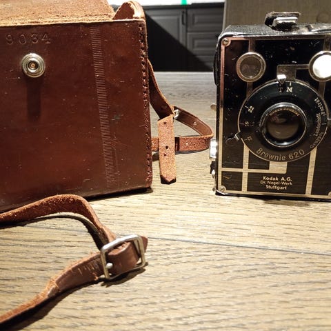 Fra 1954 med nr. 1570176. Selges med 4 ruller Kodak TX 400 iso med utløpsdato 12/2023, den femte rullen sitter i kameraet nå, har to eksponeringer igjen å ta. 2 ruller Fomapan 400 iso med utløpsdato 09/2023 og 06/2023. Alt fungerer. Se eksempler på bilder/negativer. Kjøper betaler for frakt.