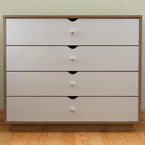 Kommode har 4 skufer, toppen av kommoden og sidene er laget av pulverlakkert metall.