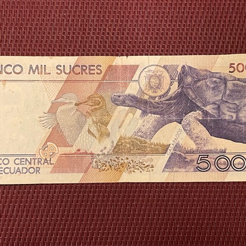 Banco Central del Ecuador 10 sucres seddel. Forsiden viser portrett av historisk person i rustning, med påskriften «Banco Central del Ecuador» og valør «Diez Sucres». Baksiden har Ecuadors riksvåpen og teksten «Diez Sucres». Seddelen er trykt i flerfarget design med detaljerte ornamenter og sikkerhetsmønstre.