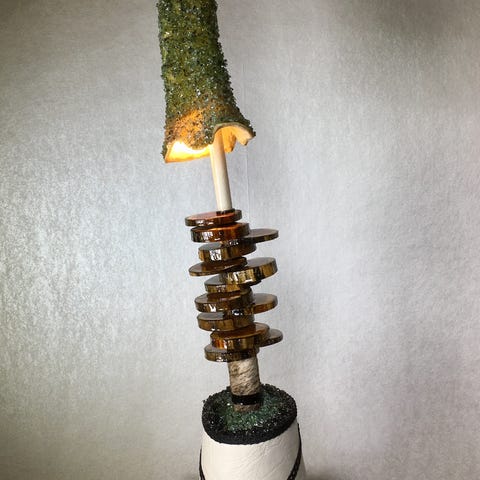 Unik bordlampe laget av tre, plast, skinn, glass, metall, bein, sand, betong