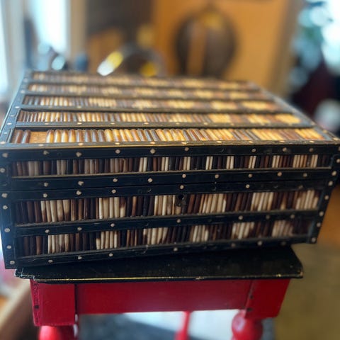 Size Medium to Large. Dress from 1910 -1920. Made in a striped black, blue and white thin woolen fabric. It has a big collar, mother of pearl buttons and a sewn on belt . It has a modesty panel in front that opens with snap buttons and that is the only opening on the dress, it slips on over the head. It is in remarkable good condition for being about 100 years old. The flaws I can find is two tiny holes at the back, that is nearly impossible to see(see pic). No labels, probably hand sewn in Scandinavia.