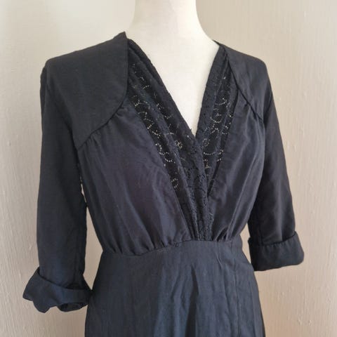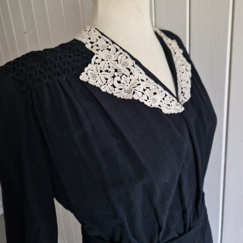 Size Medium to Large. 20s or 30s black lace dress. It has pleated details on the bust and skirt, shoulder pads and fabric covered buttons in front. It has a white satin "collar" that is tucked inside the v-neck opening. I think the fabric is rayon. No other openings, goes on over the head. No flaws to note other than some yellowing to the white satin. No labels, probably handmade in Norway.