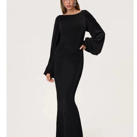 God kvalitet vakker elegant svart lang kjole med frynser tidløs og perfekt til fest eller selskap.