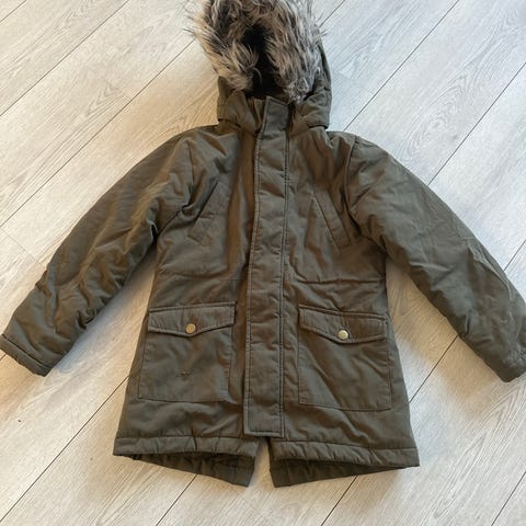 Pent og lite brukt vinterjakke (parkas) fra HM i str 140. Grå med oransje detaljer på brystlomme og innside. Pelskant på hette.