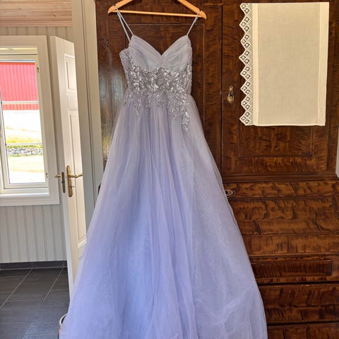 Nydelig lilla ballkjole, kan brukes på forskjellige typer fest. Jeg kjøpte 2 på nett ved feil, den på bilde var brukt 1 gang av dattera og har noe pynt , den andre ligger forsatt i pakken og er helt ny.