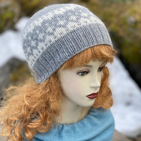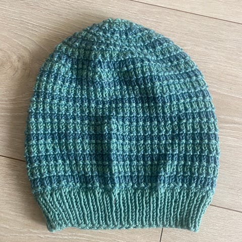 Håndstrikket, myk lue i nydelig sjøgrønn/turkis farge.