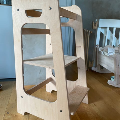Kjøkkenhjelper er en plattform innelukket på alle sider for å forhindre at pjokk faller. Vi har bygget den av laminert sponplate, så vekten gjør det enkelt å transportere det rundt i huset. Vi dekket det hele med myk PVC for å maskere alle skarpe kanter og splinter, som absolutt ikke er venner av små hender. Alle skruer er dekket med selvklebende hetter inkludert i settet.