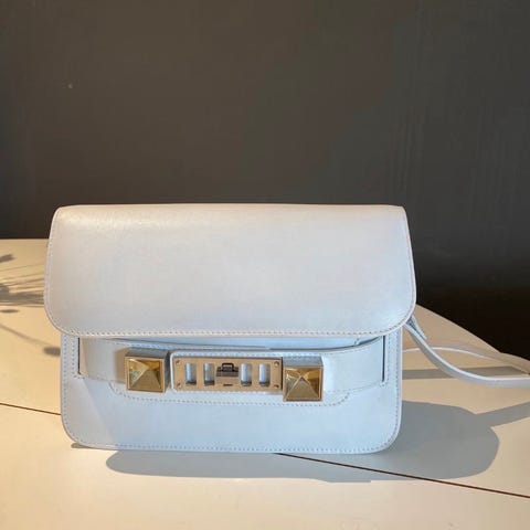 Vurderer å selge min Proenza Schouler PS 11 Mini Classic i mykt, svart skinn, med metall og vridelås i gull og sølv, og skulderrem som er justerbar og avtakbar.