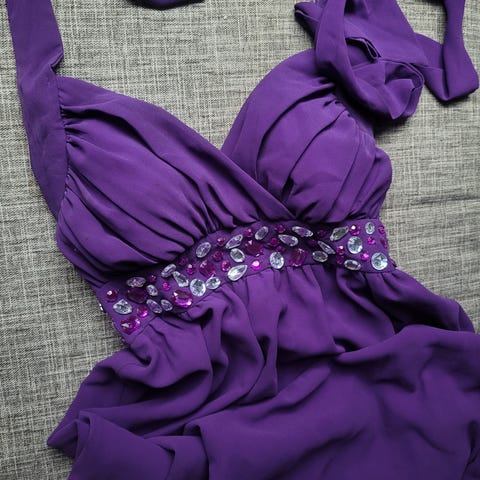 Fotside kjole som passer til bruk i bryllup og ball. Snirklete påsydd pynt av perler i svart og lilla. Skjult glidelås bak.