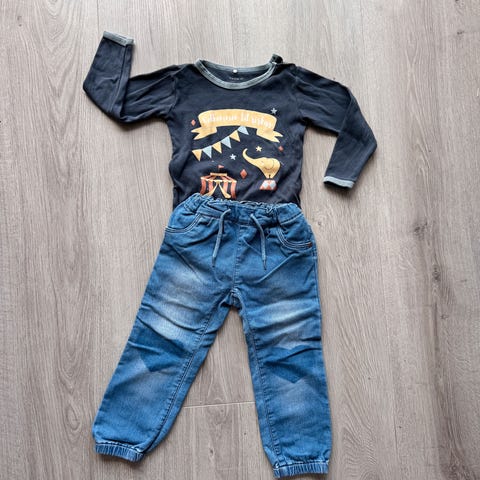 Tykk rød genser, fin kvalitet, gode mønsterdetaljer. Tykke buksejeans har dobbeltlag, tykk, fin kvalitet, med lommer.