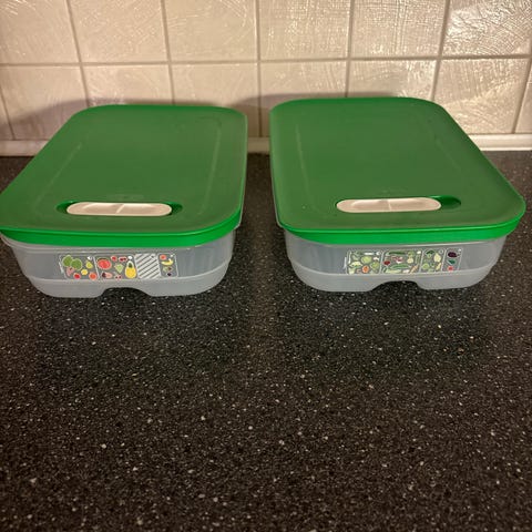 2 tøffe skåler med lokk i hardplast. Sennepsgule. Merket Kayser «Luran», tyskproduserte. Brett fra Lagerhaus, Sverige.