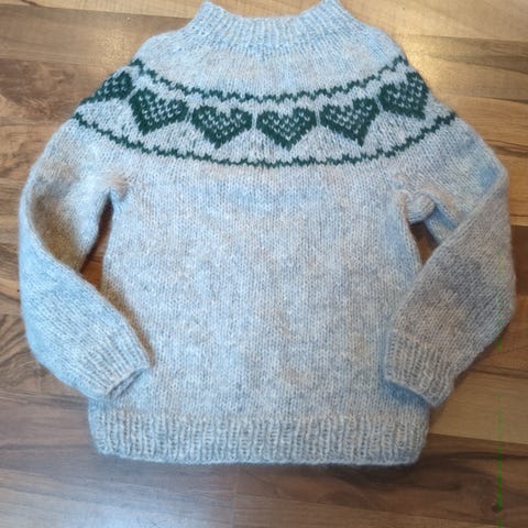 Overvidde , delvis utstrukket , men har mer å gå på: 60 cm målt under ermene. Om barnet er smalere, vil genseren føye seg etter kroppen.